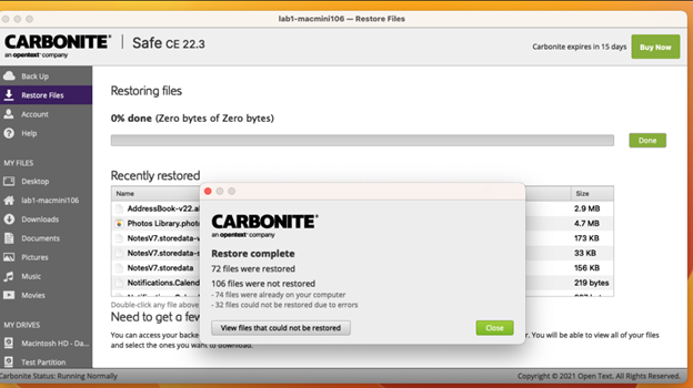 When a restore completes on Mac Ventura, bundle files may not be given proper access to complete the restore properly. This may present itself as an incomplete restore with many files failing to be recovered. The User interface will also show 0% progress after the restore is complete instead of the expected 100%.