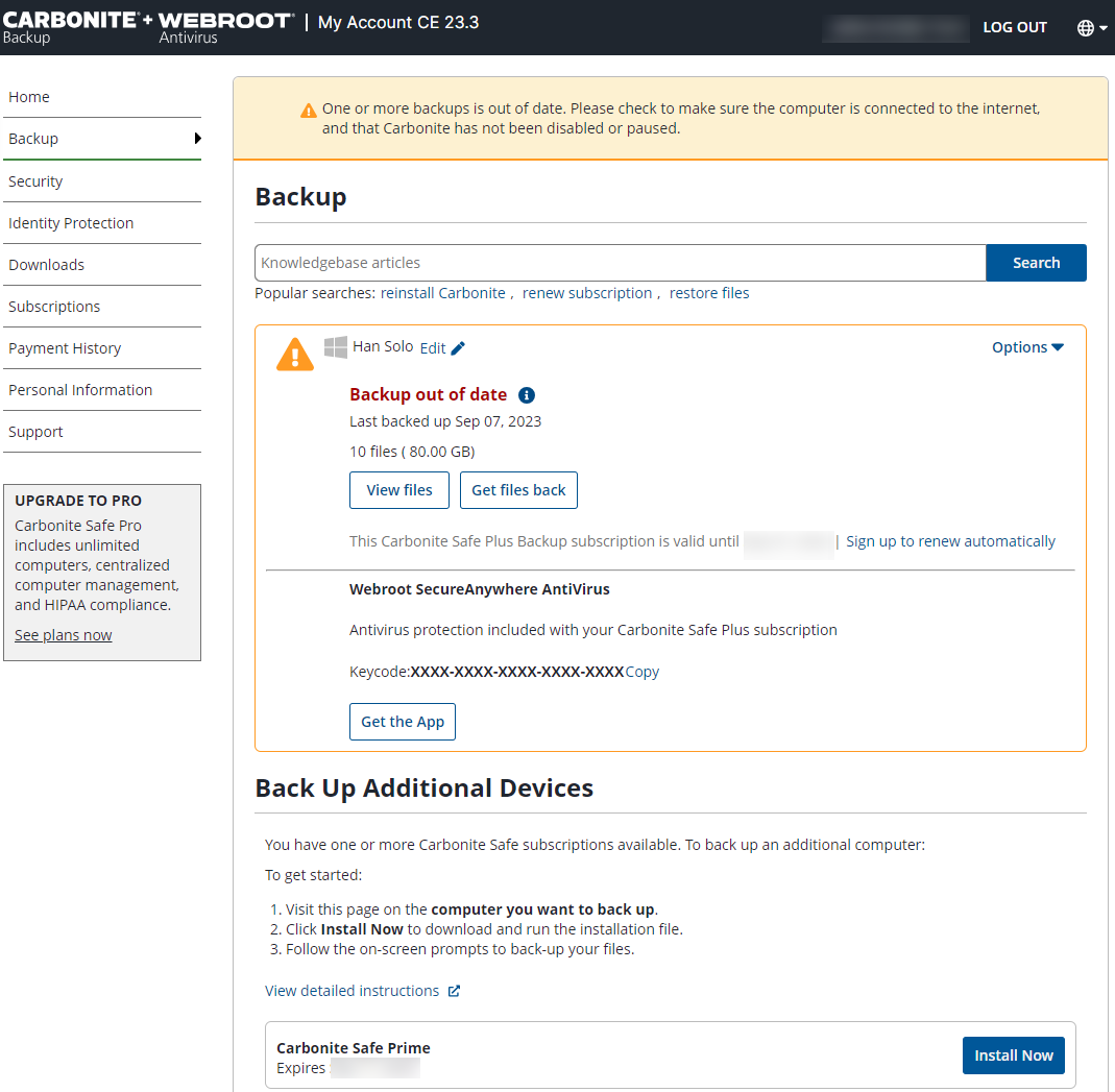 - You will only be presented with options to upgrade within the Carbonite Safe plans. If you’d like more features, you can upgrade to Carbonite Safe Backup Pro plan.