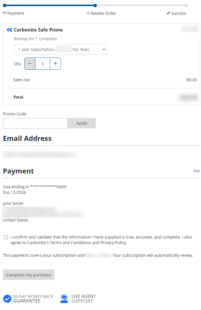 - Confirm the purchase and cart information are correct by check the box to validate the information and agree to Carbonite's Terms and Conditions and Privacy Policy and click Complete my purchase.