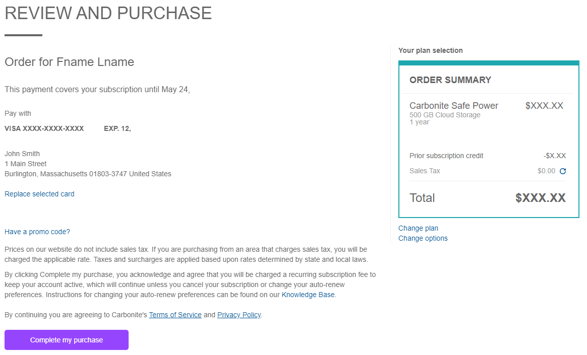 - On the next screen, you will be required to enter your credit card information if none already exists on file. This screen will also display your choice of subscription, the purchase price, any credit from your previous subscription, and the total amount to be charged. You can change your selected plan by clicking Change plan. Once you are satisfied with your selection, click Complete my purchase to continue.