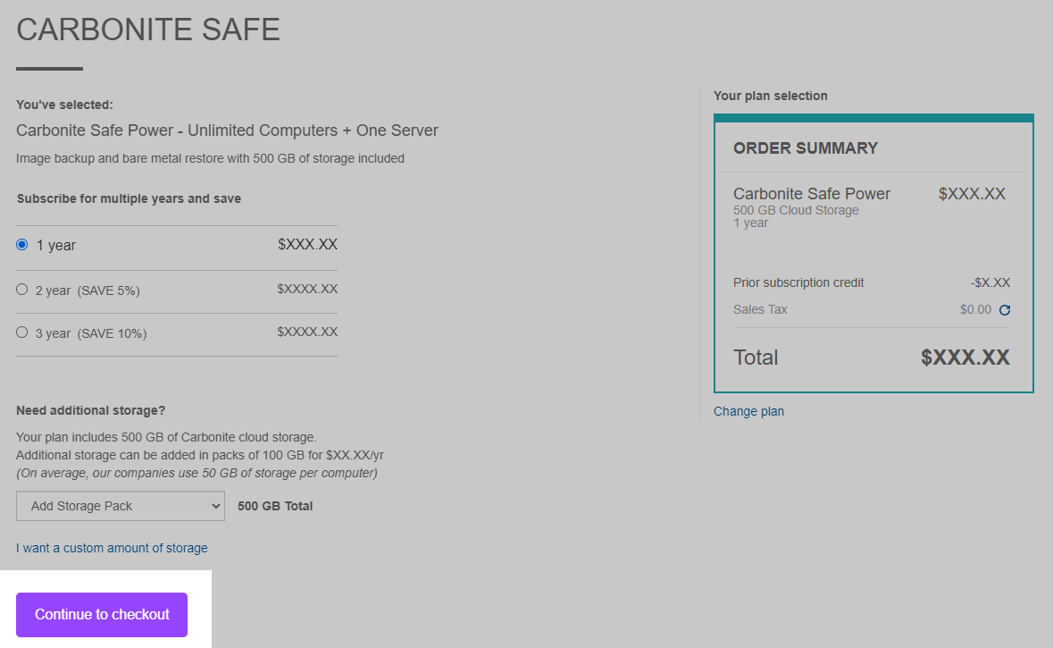 - After you choose a plan, you'll be able to choose the length of your subscription and purchase additional storage space, if necessary. Click Continue to checkout to proceed.