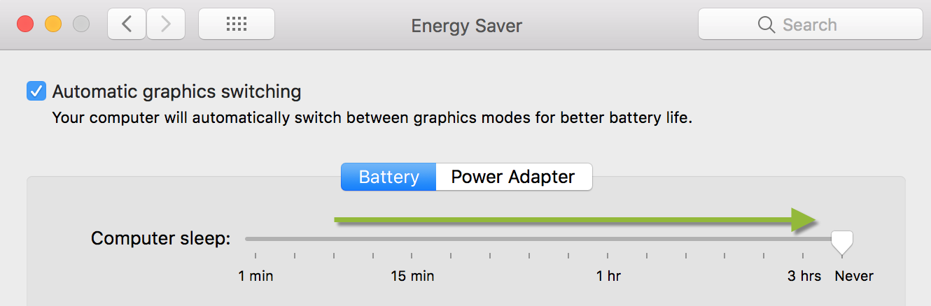 - Set the Computer sleep: slider bar to Never.