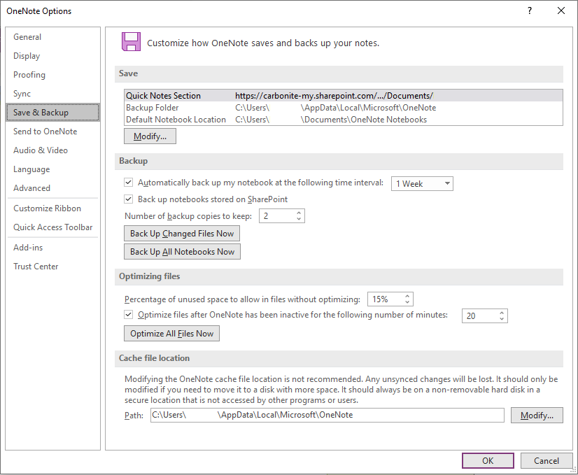 - Within OneNote, navigate to Files > Options > Save & Backup tab to adjust OneNote’s automatic backup settings.