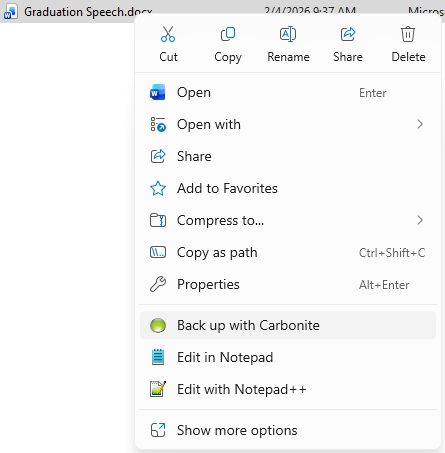 If you chose the Automatic (recommended) backup settings during the installation, Carbonite automatically selected the Desktop, Documents, Downloads, Music, and Pictures folders for backup.