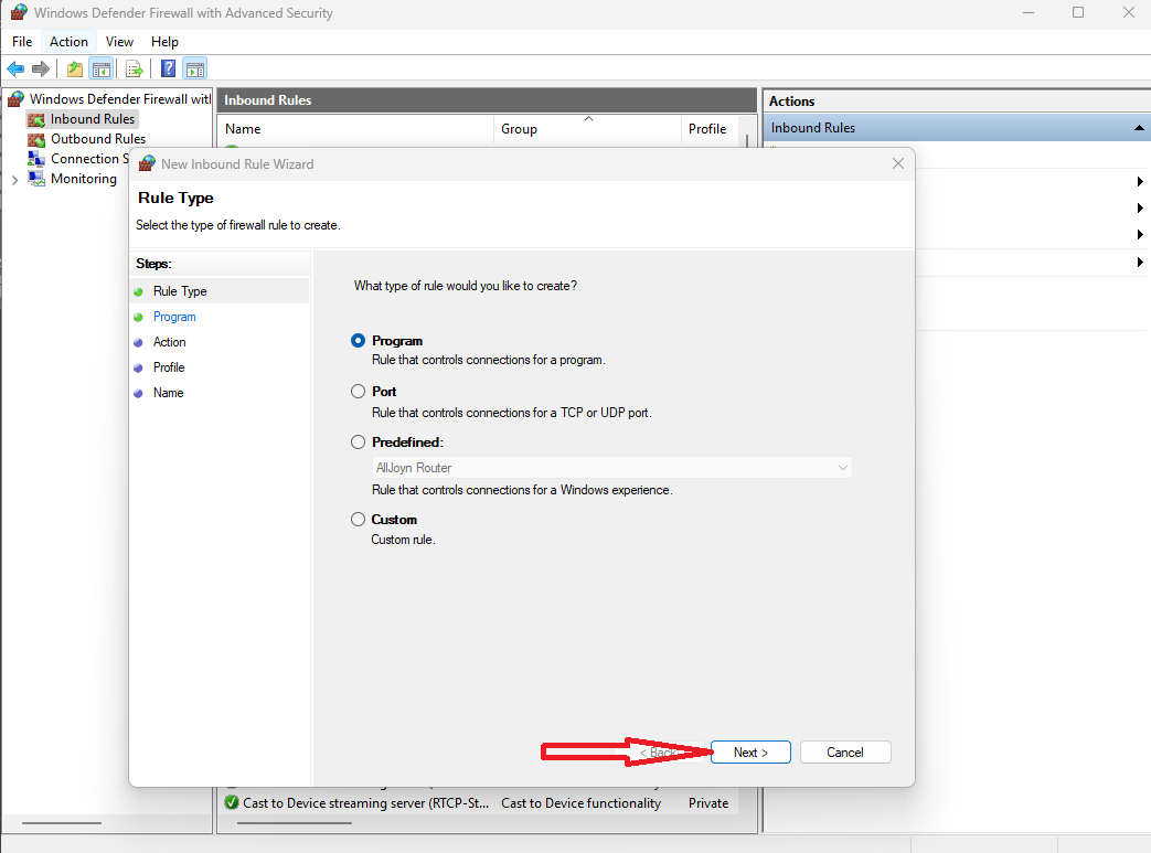 A new Windows box will appear. All needed settings for this process are automatically populated. No autogenerated settings have to be altered. You will input the New Inbound Rule Wizard to the Carbonite locations being added, and a name provided for each. In the Rule Wizard, please click Next.