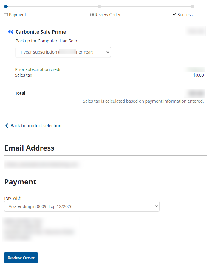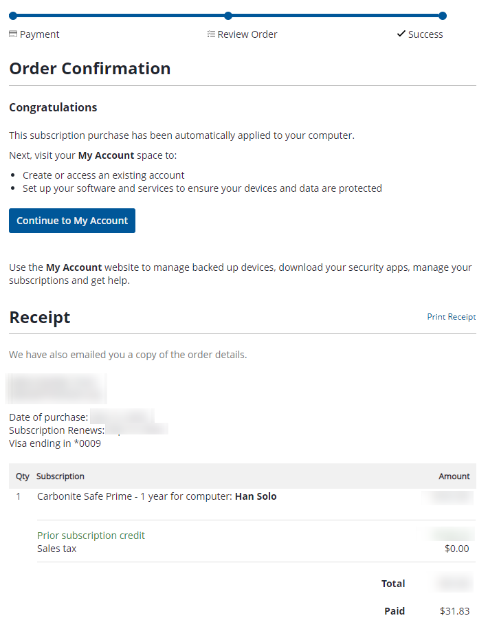 - On the order confirmation screen you can elect to Print Receipt and or Continue to My Account where you can access your account to reinstall Carbonite to ensure that you have access to the correct features.