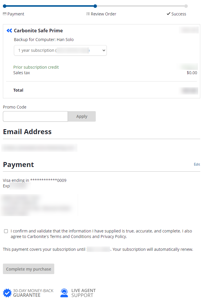 - Confirm the purchase and cart information are correct by check the box to validate the information and agree to Carbonite's Terms and Conditions and Privacy Policy and click Complete my purchase.