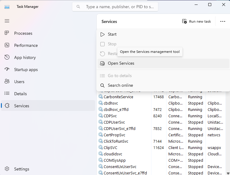 - In the new window, right-click the CarboniteService from the list and click Properties.