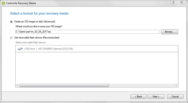 Your next step is to select the type of recovery media you wish to build. Your choices are Removable flash media which will look for a USB connected device to use as the boot media, ISO Image which will create an ISO to boot from. We recommend that you use a USB Flash Drive in order to make the Recovery Media. Make your selection and click Next.