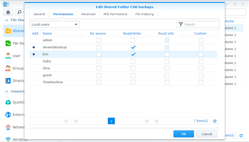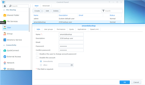 - The amandabackup / CarboniteUser user (or the account specified in Tools; Network Location) must exist on the NAS device and must have access to one or more folders. The backups will fail if the username and password used within CSSB and on the NAS device do not match.