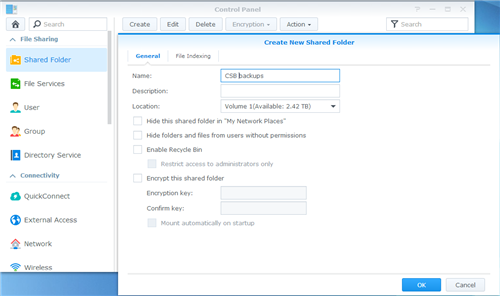 Synology users can create new shared folders easily via Control Panel; Shared Folder.