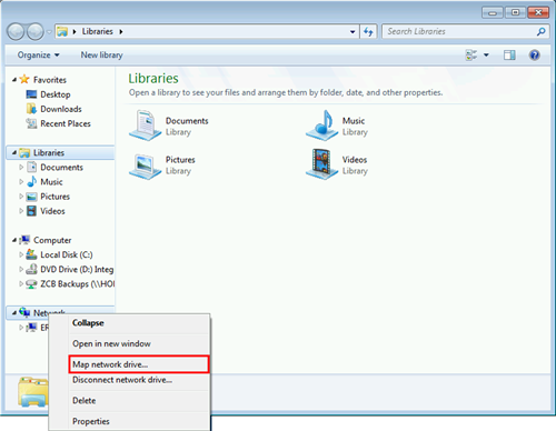 In Windows Server 2008 R2 and above, the Map network drive... option can be easily found by right-clicking the Network or Computer items in Windows Explorer.