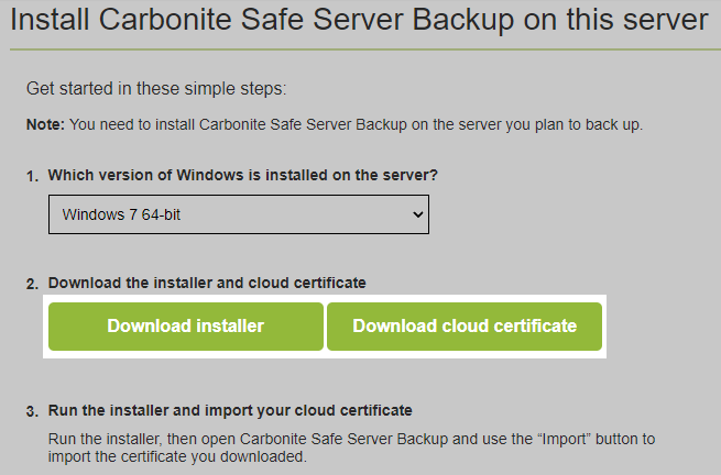 An installation page will appear. You must select the version of Windows running on the server in order to get the correct installer and Cloud Certificate.