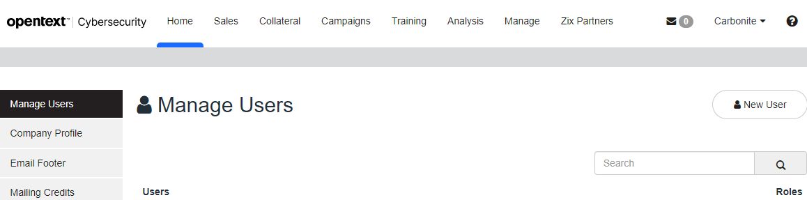 You will be presented with the Manage Users page. On this page, you will have the ability to control access to your organization. To invite an employee, click the button for New User.
