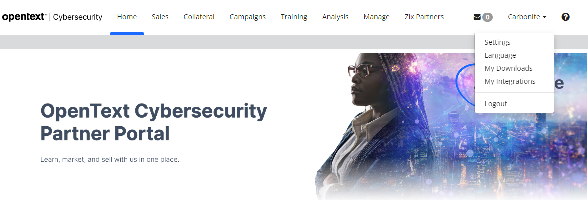 Once signed in, click on Home in the upper taskbar, this will bring you to the Partner home page. Once there, Go to your name in the upper right drop-down and select Settings.