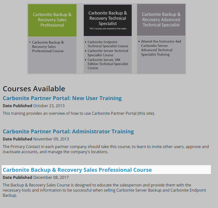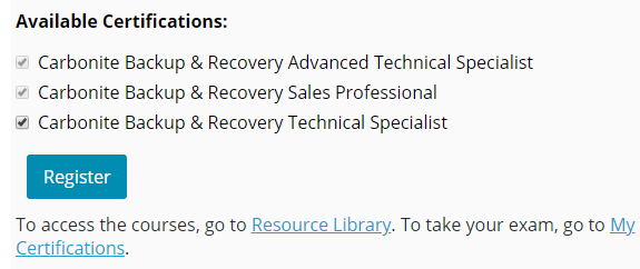 Carbonite offers certifications for our Carbonite Server Backup, Availability and Migration software. Completing these certifications authorizes you to register deals and gain additional margin for sales. You can register for certifications at any time, however you should review the related course material in the Resource Library before taking any exams associated with your desired certification.