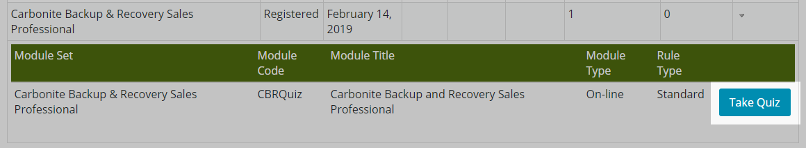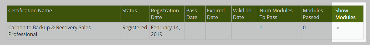 - Locate your desired certification and select the downward pointing arrow under the Show Module column.