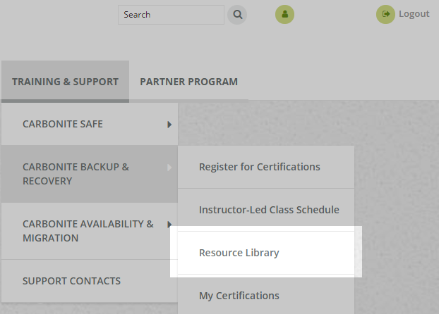 - Under the Training & Support header within the Partner Portal home page, hover over the applicable product line and click Resource Library.