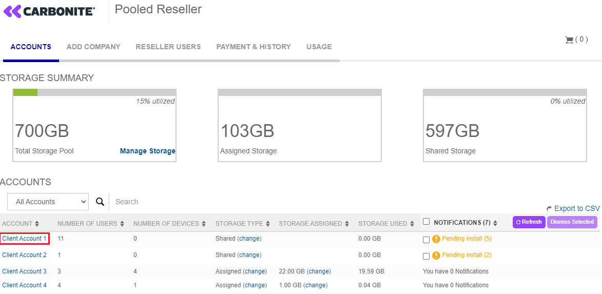 To install CSSB, log into your Pooled Reseller Portal at https://portal.carbonite.com/#/accounts and follow the instructions below.